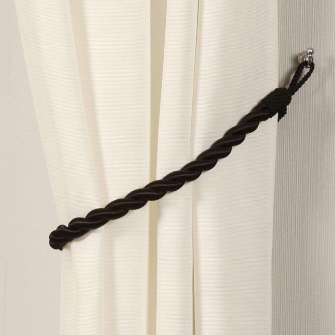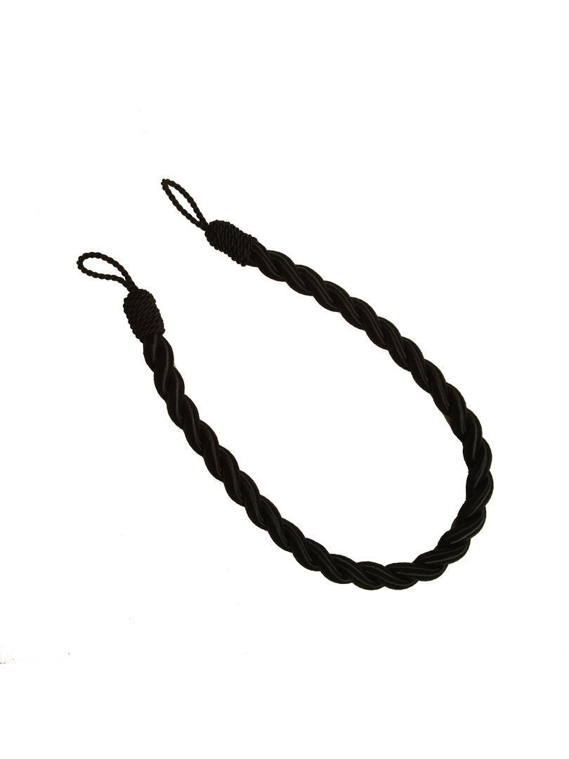 Glanzende zwarte embrasse van een gedraaid koord. Mooie soepele kwaliteit waarvan de uiteinden omwikkeld zijn met dunner gedraaid koord. Volledige lengte embrasse 81 cm incl. lussen. De dikte van het koord is 2 cm.
