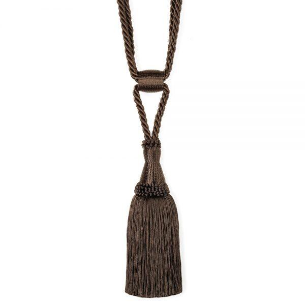 Donkerbruine embrasse met een grote kwast en twee lange lussen. De volledige lengte van de embrasse is ongeveer 65 cm. De lengte van de kwast tot het begin van het koord is 20 cm. Deze embrasse is te gebruiken in combinatie met een embrassehaak.
