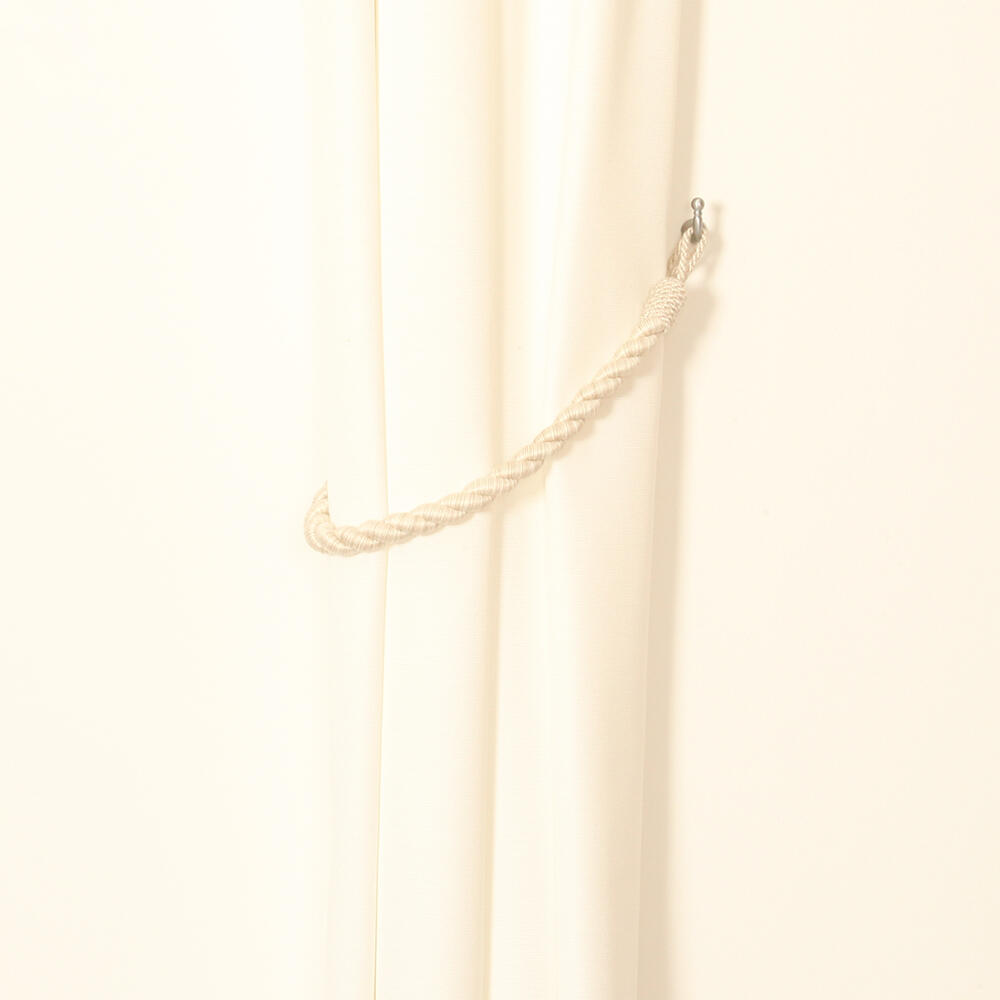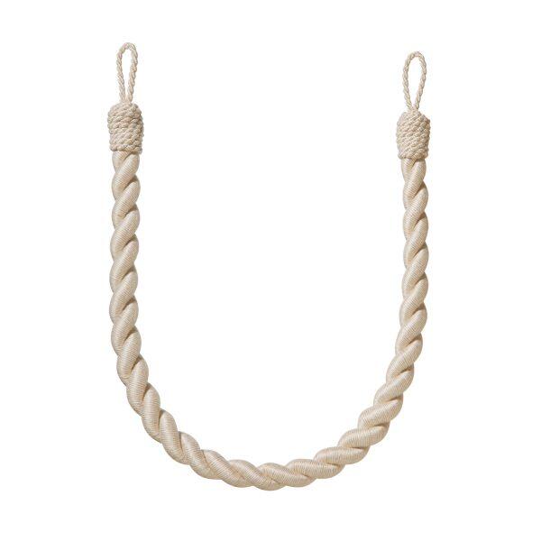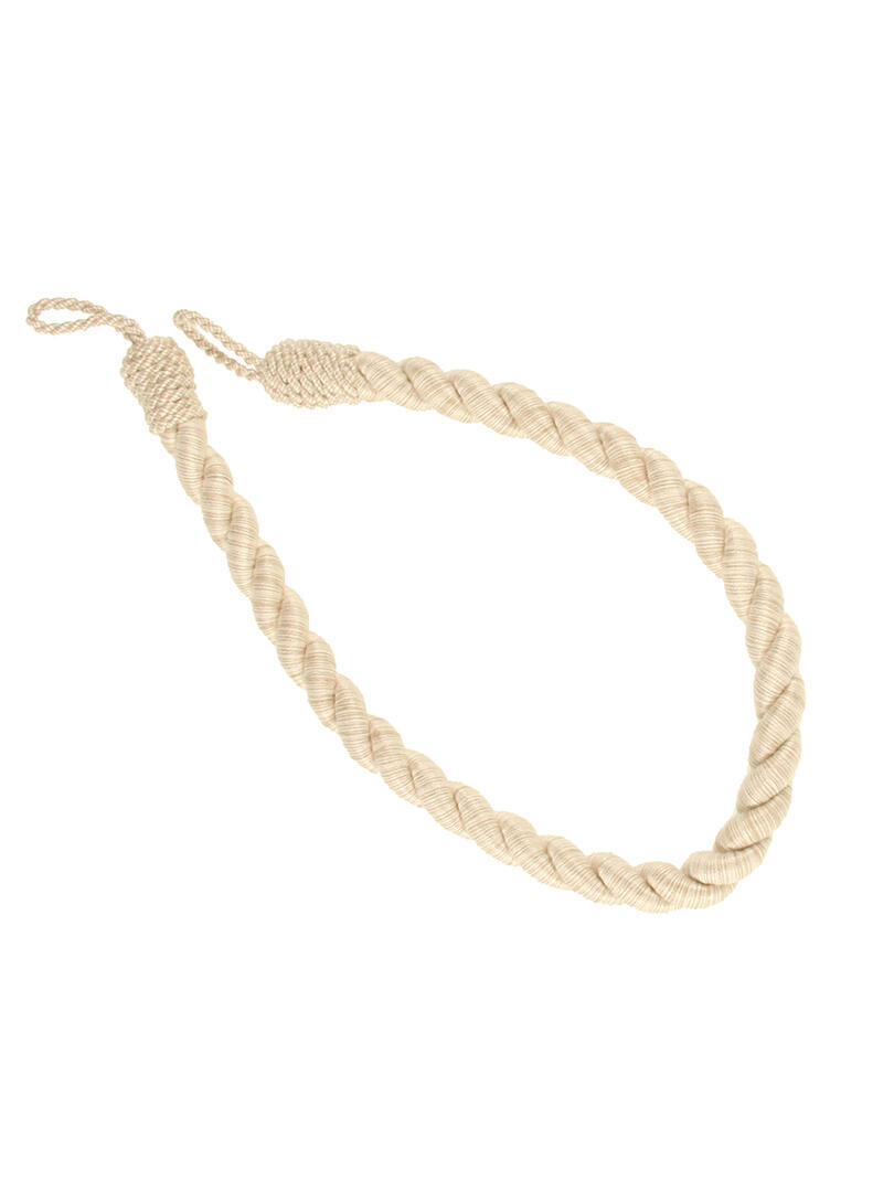 Zijdematte naturelkleurige embrasse van een gedraaid koord. Mooie zachte kwaliteit waarvan de uiteinden omwikkeld zijn met dunner gedraaid koord. Deze embrasse dient te worden gebruikt in combinatie met een embrassehaak. Volledige lengte embrasse 80 cm incl. lussen.