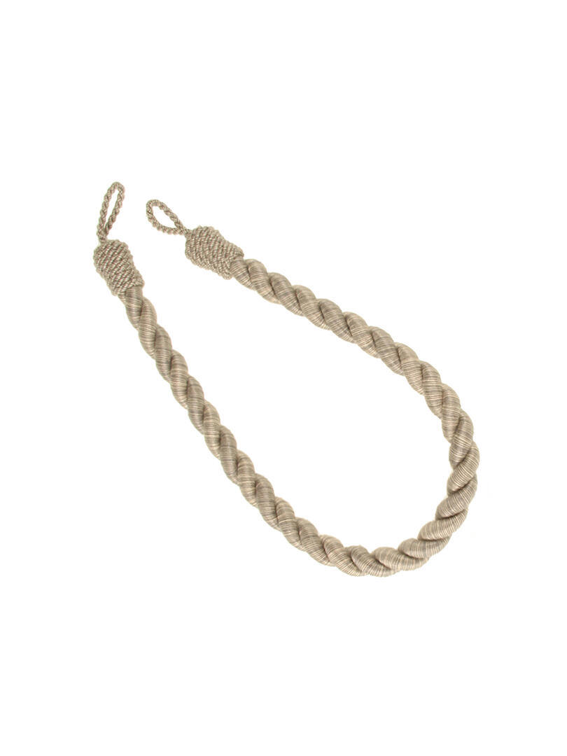 Zijdematte warmgrijze embrasse van een gedraaid koord. Mooie zachte kwaliteit waarvan de uiteinden omwikkeld zijn met dunner gedraaid koord. Deze embrasse dient te worden gebruikt in combinatie met een embrassehaak. Volledige lengte embrasse 80 cm incl. lussen.