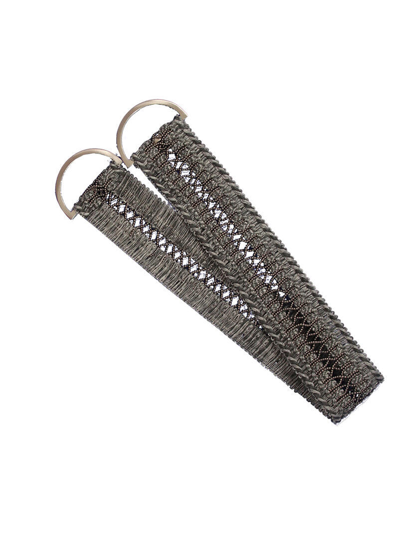 Brede stoffen embrasse in een grijze kleur. Breedte van het band is 6,8cm. De lengte van de embrasse tussen de metalen ringen is 71,5cm. De totale lengte inclusief ringen is 79cm. De uiteinden van de embrasse zijn voorzien van een metalen ring.