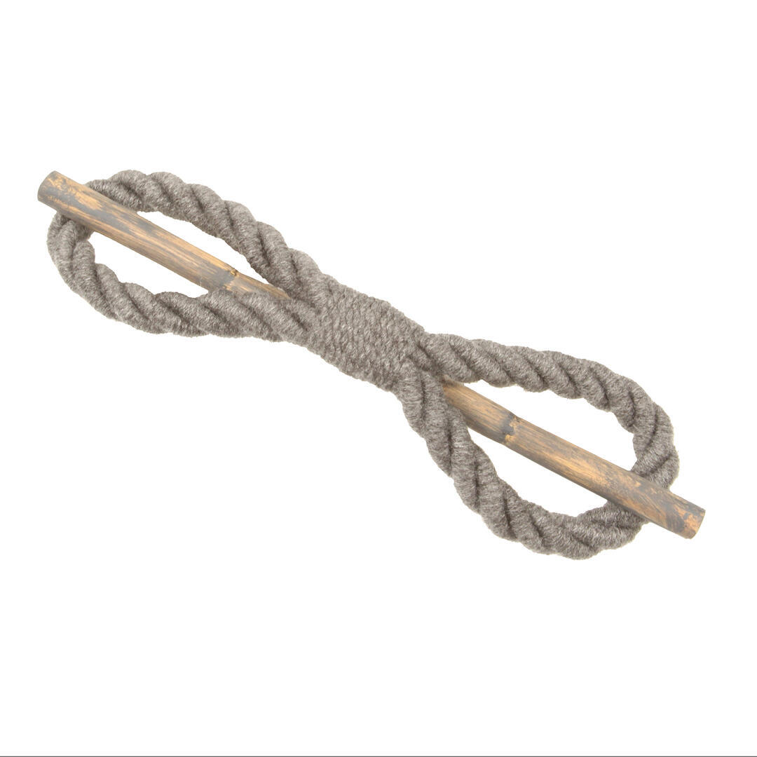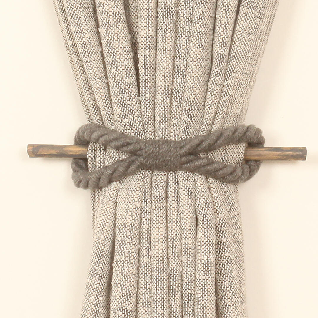 Een eigentijdse embrasse van gedraaid koord in vlindervorm met bamboe stok. In verband met de lengte van de embrasse is deze geschikt voor lichtere gordijnen of Inbetweens en voor smallere ramen. De embrasse zelf is ongeveer 22cm, het bamboestokje om de embrasse vast te zetten is ongeveer 24 cm.