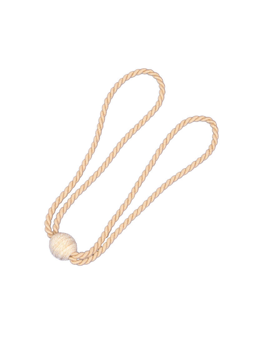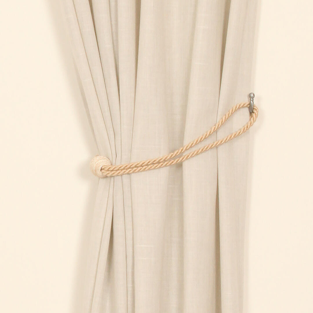 Embrasse van gedraaide koorden in matte zandtinten. Door de weving heeft de knop in het midden een gemeleerde look. De knop in het midden kan niet verschoven worden. Beide uiteinden van de embrasse zijn twee grote lussen voor een gemakkelijke bevestiging aan een embrassehaak