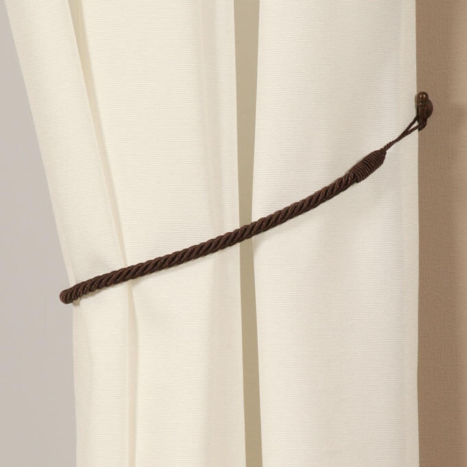 Bruine embrasse van glanzende gedraaide koorden, voorzien van ophanglusje van dunner koord. De lengte tussen de ophanglussen is 60 centimeter. De koorddikte is 1 centimeter.