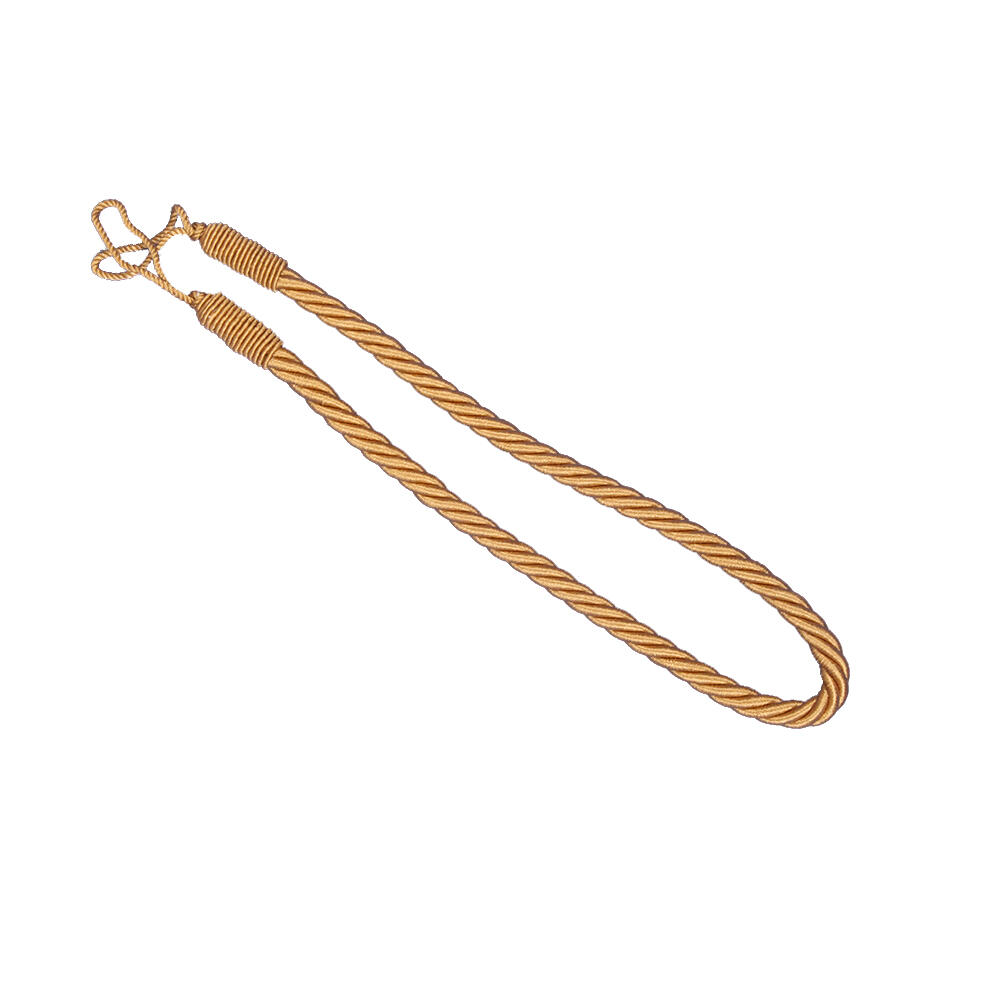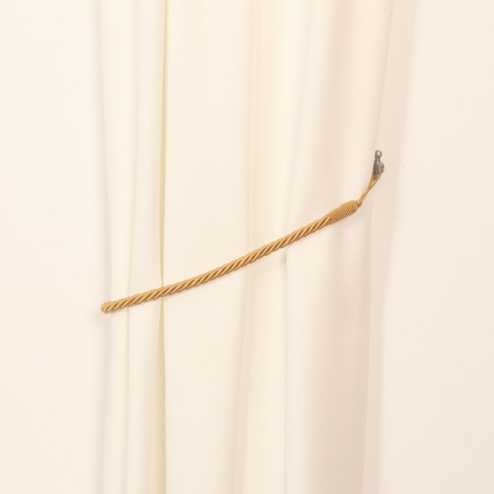 Goudbruine embrasse van glanzende gedraaide koorden, voorzien van ophanglusje van dunner koord. De lengte tussen de ophanglussen is 60 centimeter. De koorddikte is 1 centimeter.