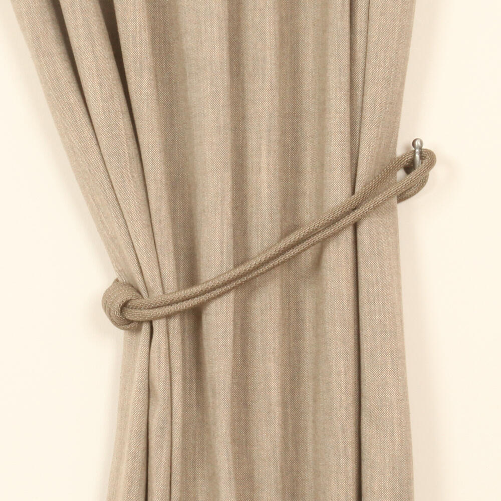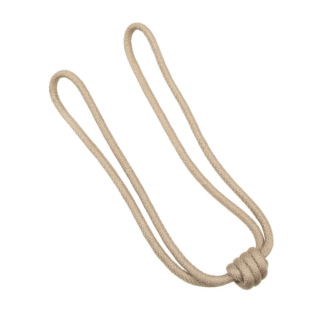 Embrasse met een glanzende look en een zeer fijne "gebreide" structuur. Deze soepele embrasse is voorzien van grote lussen. In het midden is de embrasse voorzien van een "drievoudige" knoop. De embrasse heeft een totale lengte van 64cm recht gemeten en een koorddikte van 1cm. Beide lussen zijn 30cm en de knoop is 4cm.