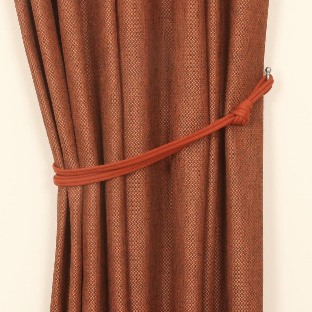 Bijzondere embrasse met een "linnen" look. Deze embrasse heeft 3 koorden die onder elkaar hangen om het gordijn tegen te houden. de koorden hebben een dikte van 3mm en zijn 1,2cm breed. Elke koord heeft een ingestikte naad waardoor een effect onstaat alsof het een dubbel koord lijkt. Aan het uiteinde bij de bevestigingslus zit een knoop. De lengte van de embrasse is ongeveer 85cm. De bevestigingslus is ongeveer 5,5cm en de knoop is ongeveer 4,5cm.