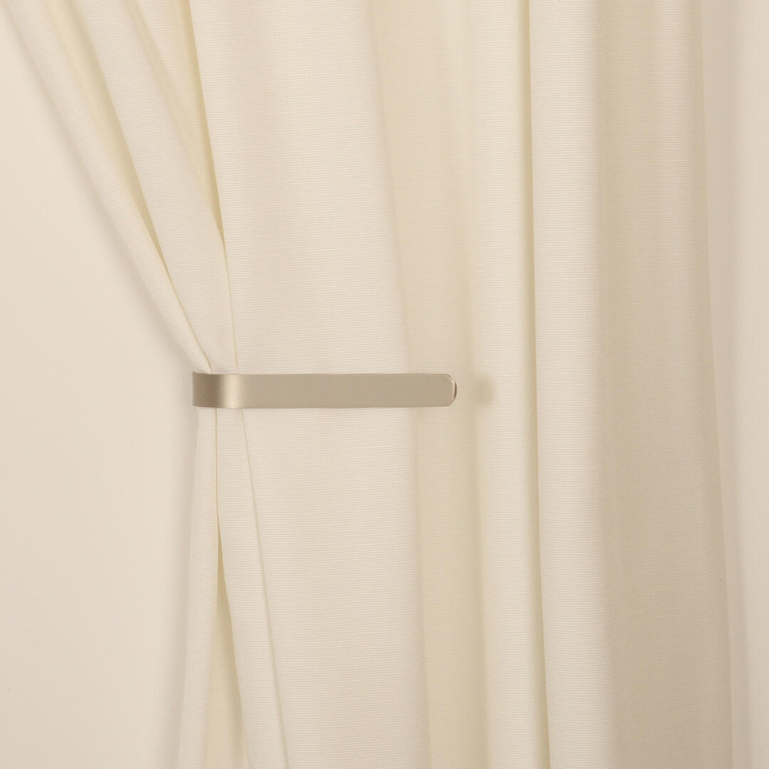 Stevige metalen embrasse in nikkel geborsteld. Het gordijn wordt achter de haak gehangen.