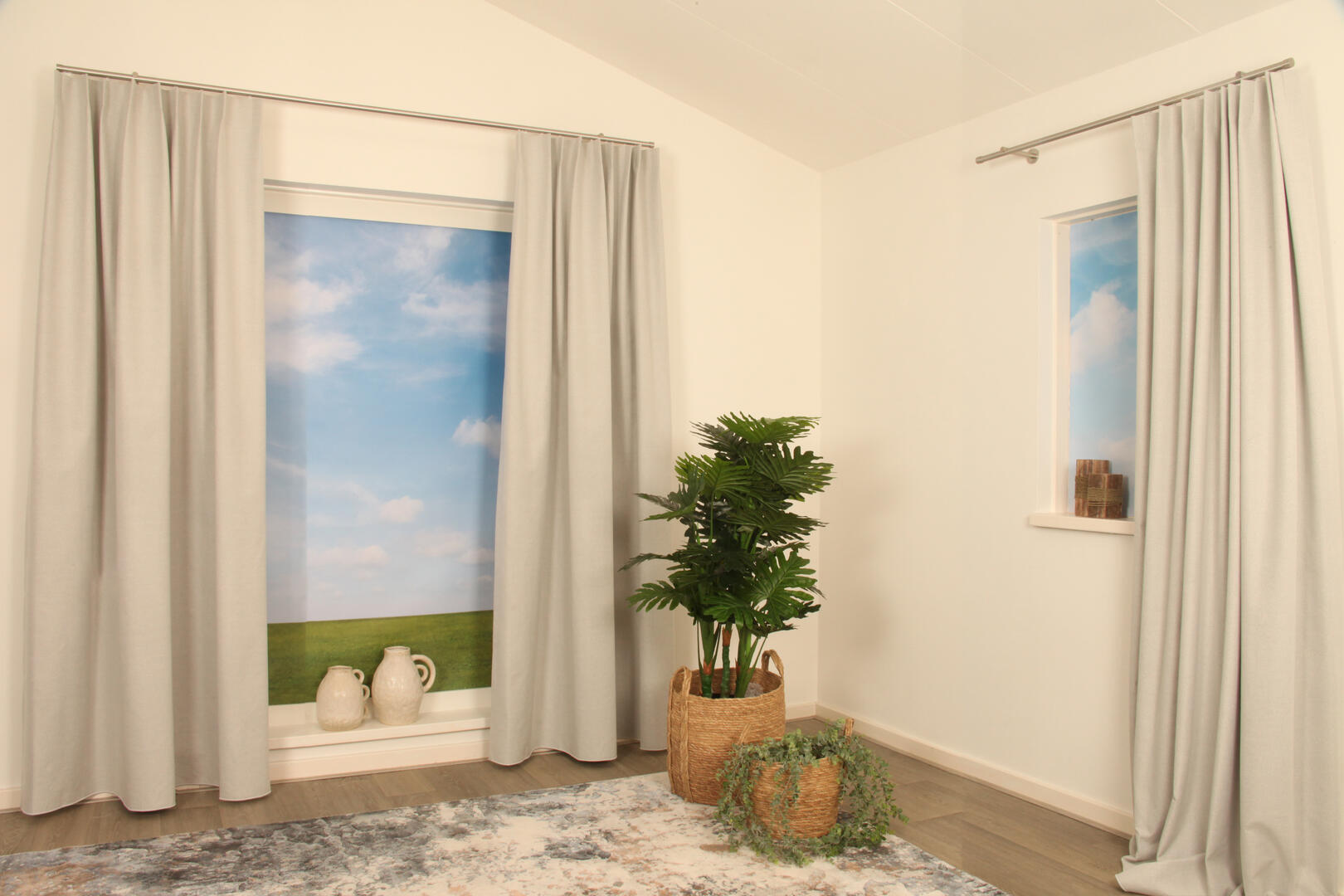 Deze stof is kamerhoog, wat betekent dat deze gordijnen naadloos kunnen worden geconfectioneerd voor een luxe en elegante uitstraling.