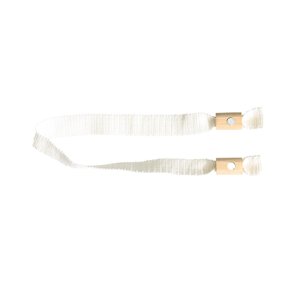 Stoere embrasse van een dikker gevlochten band in een mat garen. De band is voorzien van twee magneten die in dikke houten cilindervormige kralen zitten verwerkt, de embrasse bevestig je met de magneten aan het gordijn. De embrasse heeft een breedte van 3cm en een lengte van 64cm.