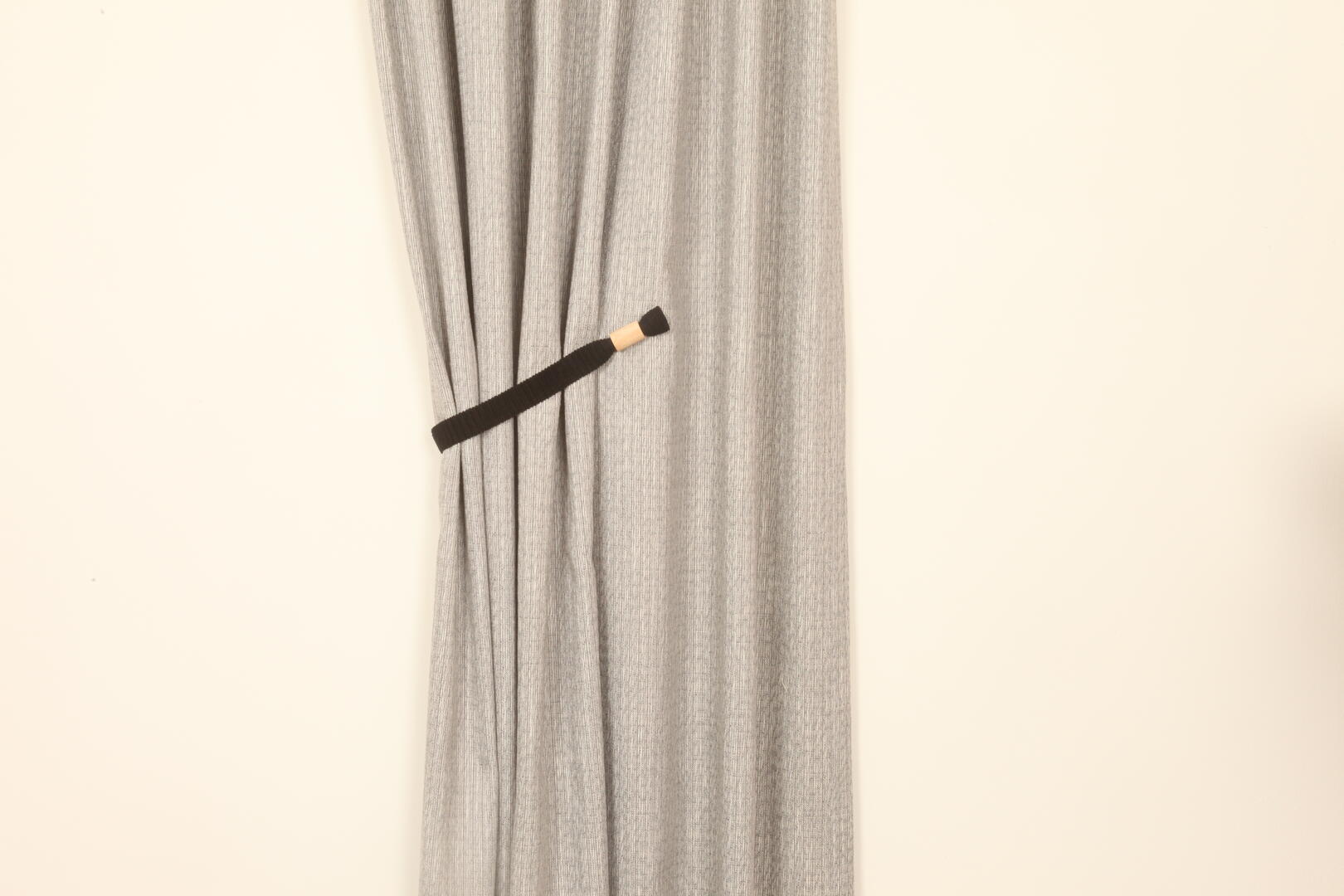 Stoere embrasse van een dikker gevlochten band in een mat garen. De band is voorzien van twee magneten die in dikke houten cilindervormige kralen zitten verwerkt, de embrasse bevestig je met de magneten aan het gordijn. De embrasse heeft een breedte van 3cm en een lengte van 64cm.