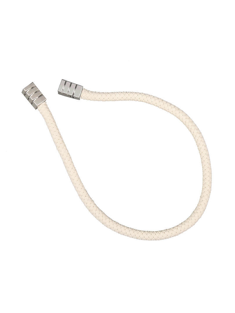Embrasse van een dikker gevlochten koord in een lichtglanzend garen. Het koord komt uit in een mat zilveren magneethouder met inkepingen. De embrasse wordt met de magneten aan het gordijn bevestigd. Het koord heeft een dikte van 1,4cm en een lengte van 67cm. De totale lengte van de embrasse inclusief de magneethouders is 74cm.