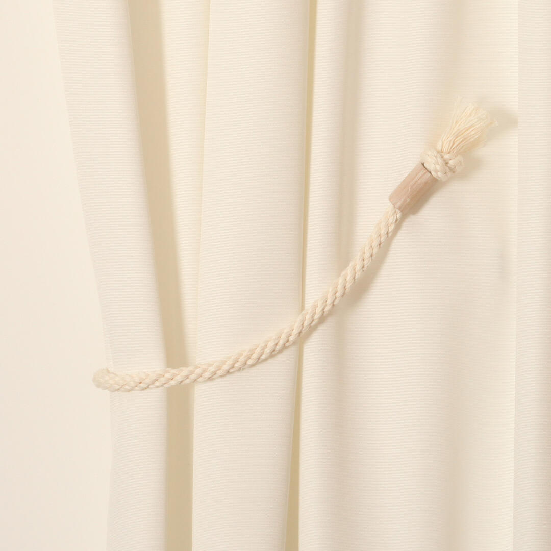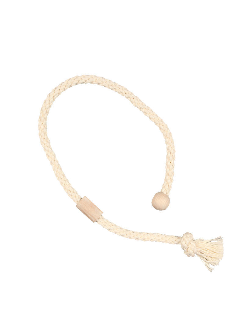 Grof gevlochten embrasse met een sterke magneetbevestiging. De ene zijde van het koord loopt uit in een houten knop waarin een magneet zit. De andere magneet kan verschoven worden over het koord om de lengte van de embrasse aan te passen. Het andere uiteinde van het koord is geknoopt en loopt uit in een kort kwastje van ongevlochten garens. Het koord heeft een dikte van 2cm, de volledige lengte van de embrasse is 90cm. De maximale maat tussen de magneten is 74cm.