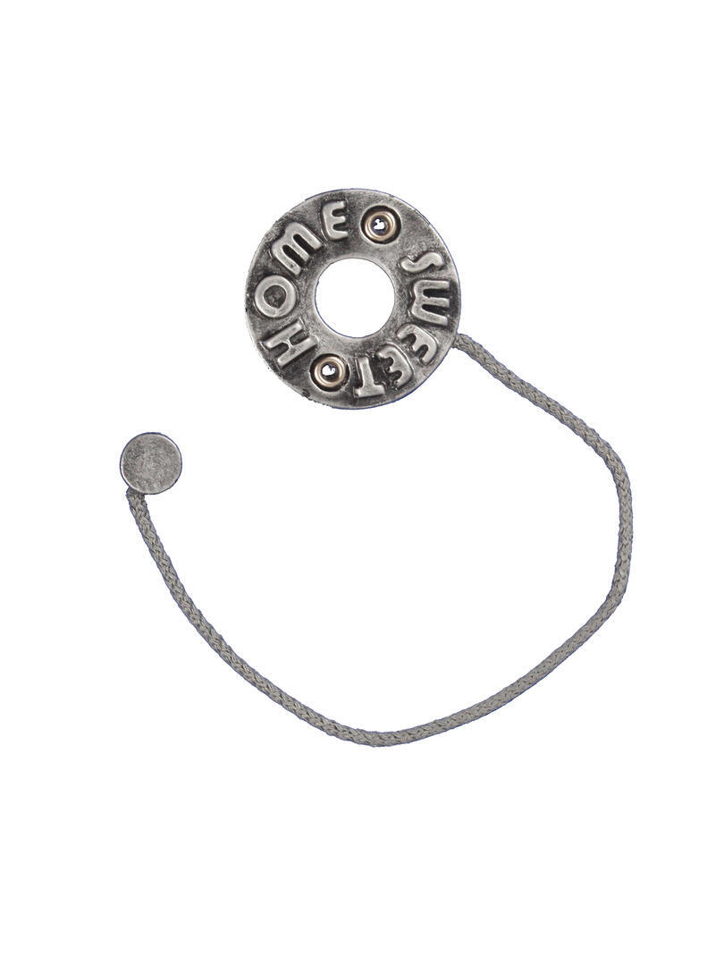 Decoratieve embrasse met de tekst HOME SWEET. De kunststof ring waarin een magneet verwerkt zit heeft 3 openingen waarvan de twee kleinere afgezet zijn met metalen ringen.