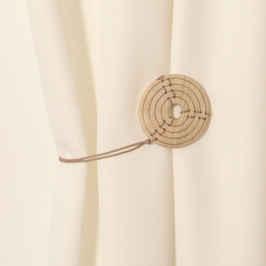 Magneet embrasse uitgevoerd in hout, doorvlochten met koord. Hetzelfde koord vormt de verbinding met het tweede deel van de embrasse. De knop aan de voorzijde is gedecoreerd met ringen van dun, gedraaid, metaal. De houten knop heeft een buitenmaat van 9,5cm en in het midden een opening. Het koord heeft een lengte van 34 cm.