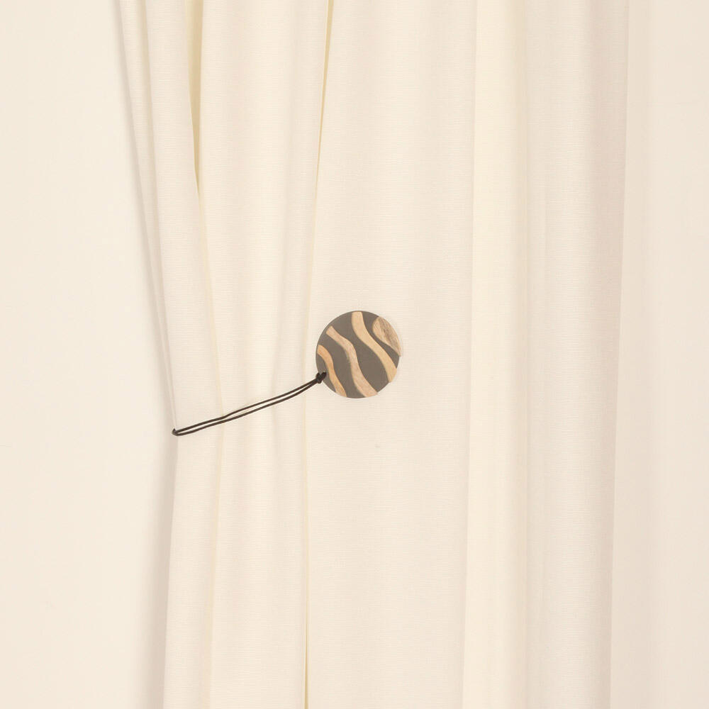 Magneet embrasse uitgevoerd met een knop van hout voorzien van een patroon door hoogte en kleurverschil. Beide knoppen zijn voorzien van sterke magneten waarmee ze aan elkaar bevestigd worden.