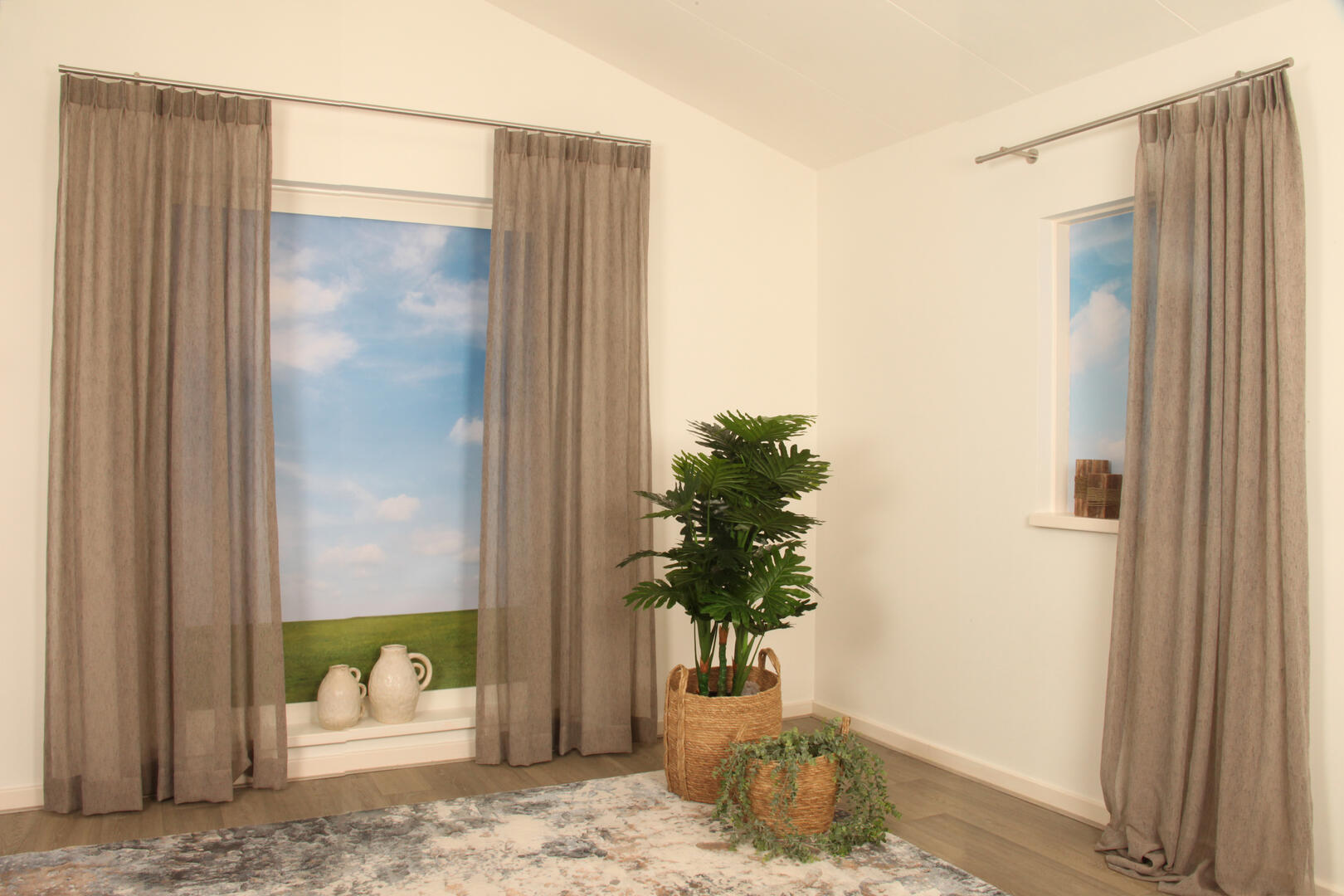 Doordat de stof kamerhoog is, kan deze naadloos gemaakt worden. De stof valt soepel en is daardoor erg geschikt voor een wave plooi. Natuurlijk kun je ook kiezen voor een enkele of dubbele plooi.
