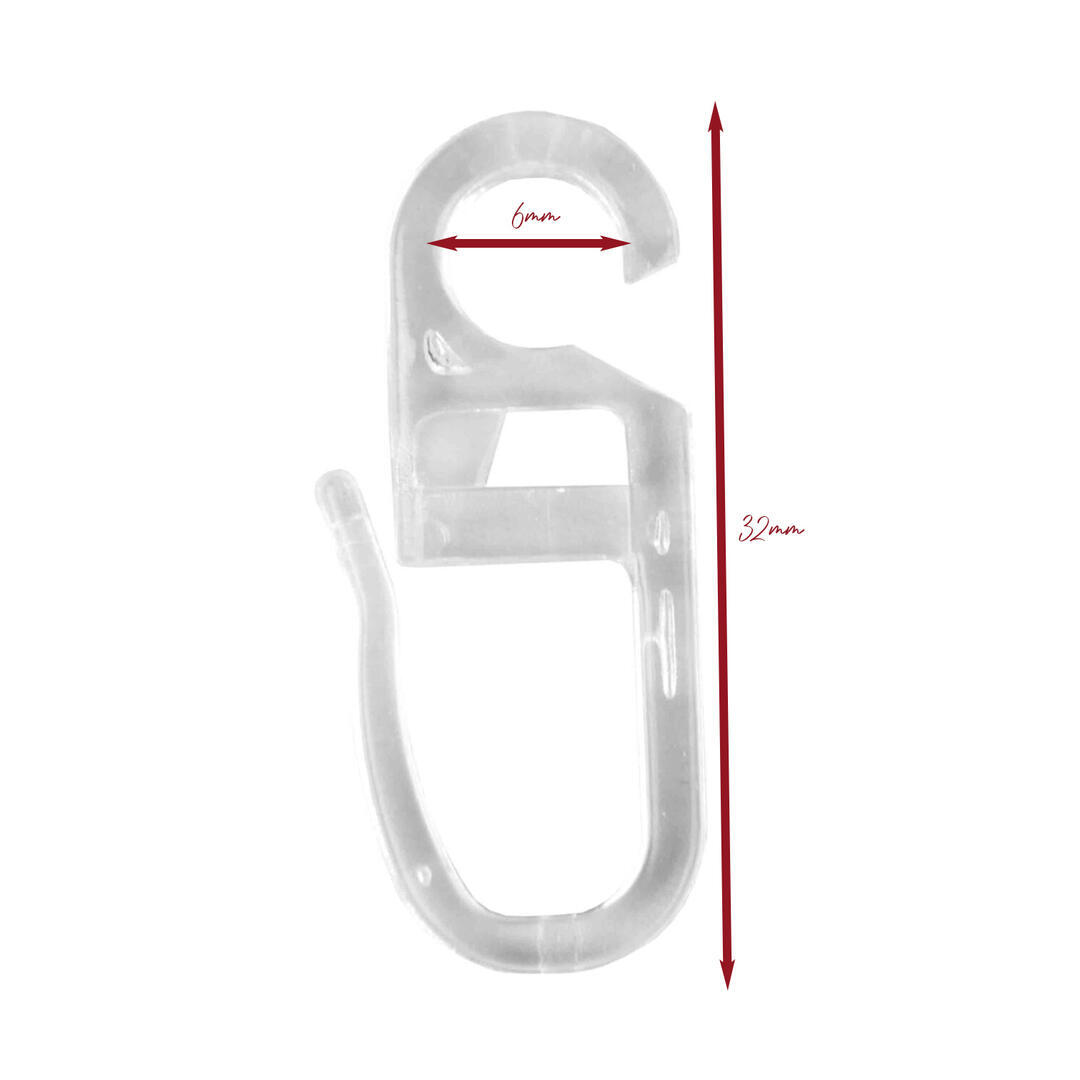 Transparante plooihaken in een set van 10 stuks geschikt voor ringen die gebruikt worden bij roedes van 16mm. Bekijk de foto's voor de maten van deze clip. Deze clip kan gebruikt worden in combinatie met gordijnhaken of met gordijnband dat voorzien is van lusjes.