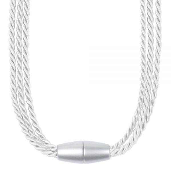 Glanzende embrasse in een witte kleur. De embrasse is gemaakt van drie dunnere gedraaide koorden en wordt gesloten d.m.v. magneten aan de uiteinden. De volledige lengte van de embrasse is 64 cm incl. magneet.