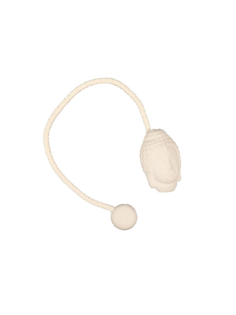 Magneet embrasse met een decoratieve knop in de vorm van een boedha. Een naturel koord verbind de knop met het tweede deel van de magneet die verwerkt is in een naturelle gladde knop. Het koord heeft een dikte van 6mm en een lengte van 33cm. De totale lengte van de embrasse is 38cm. De knop heeft een hoogte van bijna 7cm en een breedte van 4,5cm. De ruwere afwerking geeft de embrasse een verouderde look.