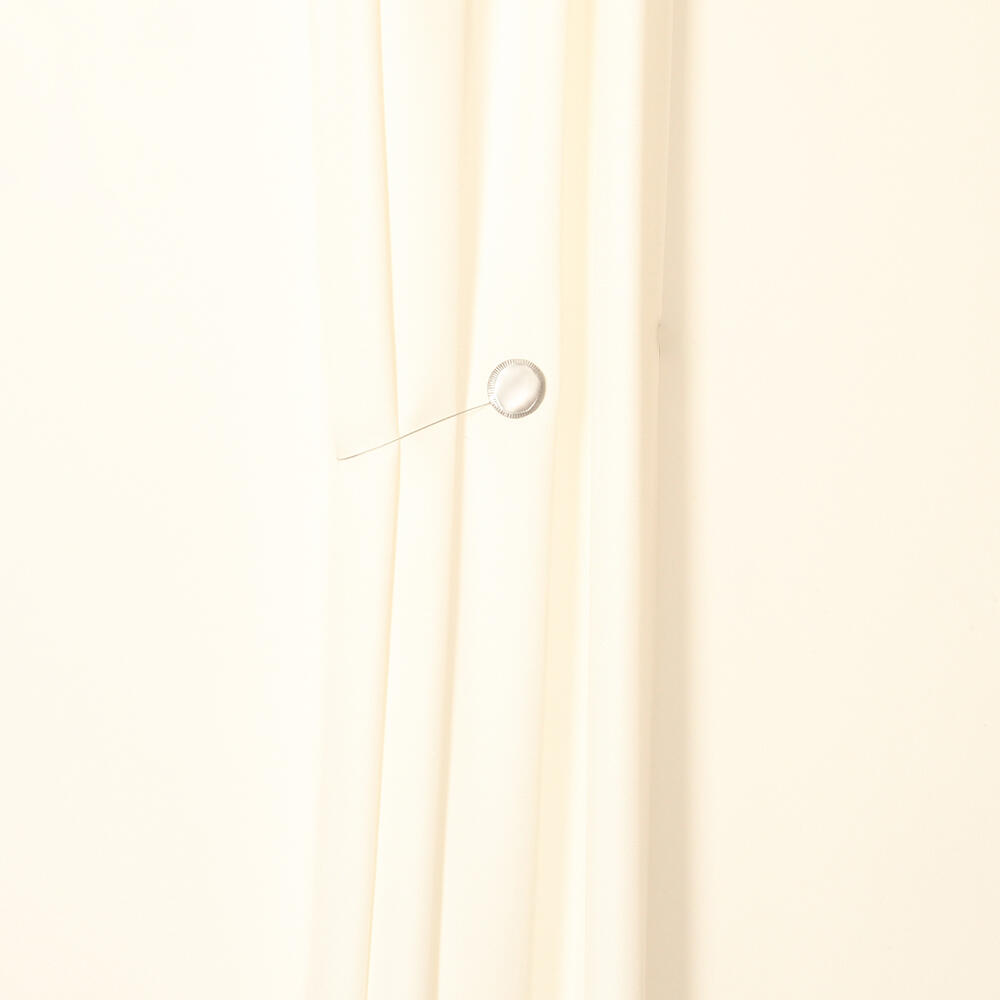 Magneet embrasse uitgevoerd met een staalkabel en metalen knoppen. De knoppen zijn mat nikkel geborsteld. De lengte van de staalkabel is 35,5cm. De knop aan de voorzijde heeft een diameter van 5cm. De volledige lengte van de embrasse is 43cm.