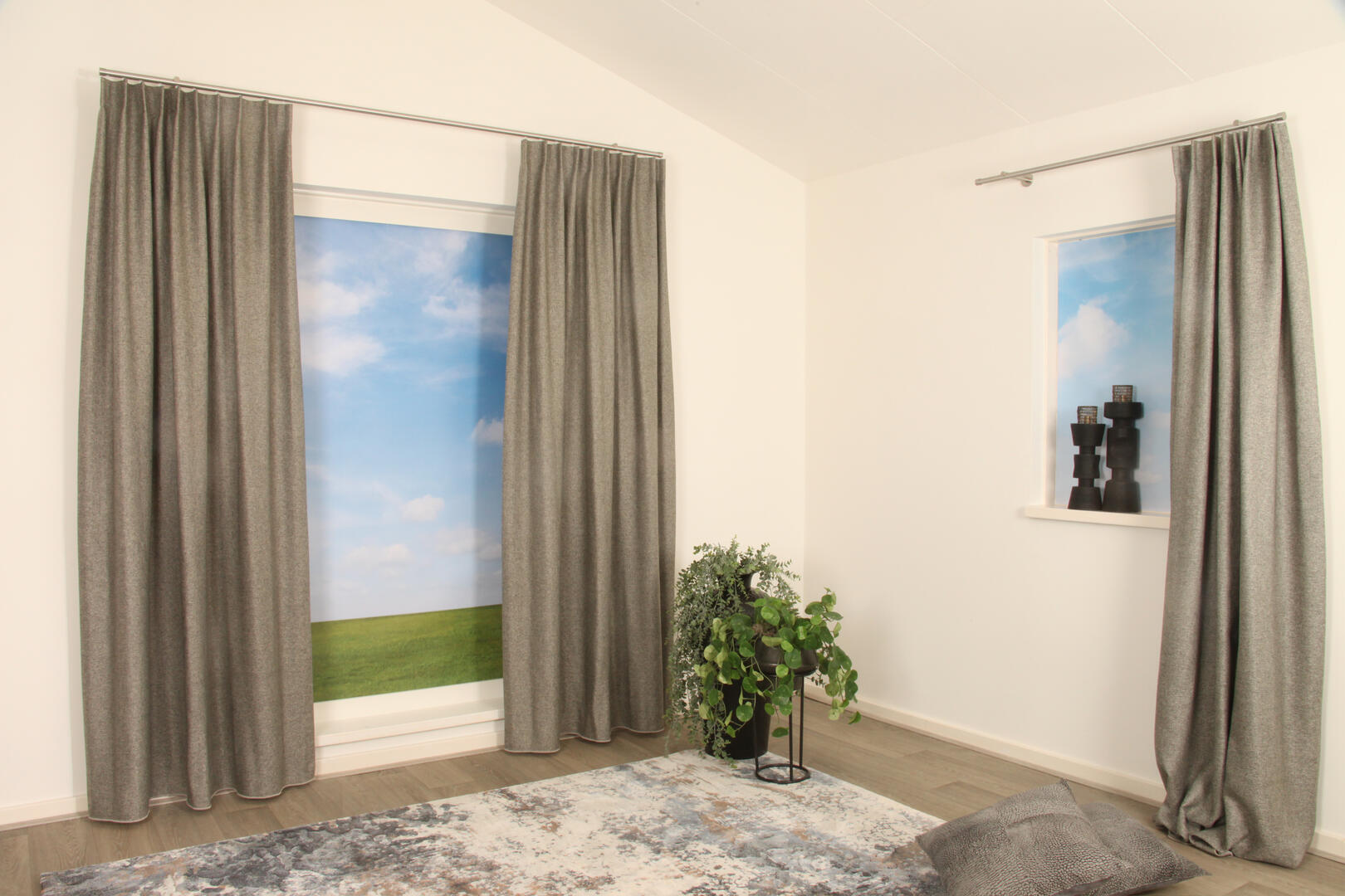 Deze stof is kamerhoog, wat betekent dat deze gordijnen naadloos kunnen worden geconfectioneerd voor een luxe en elegante uitstraling.