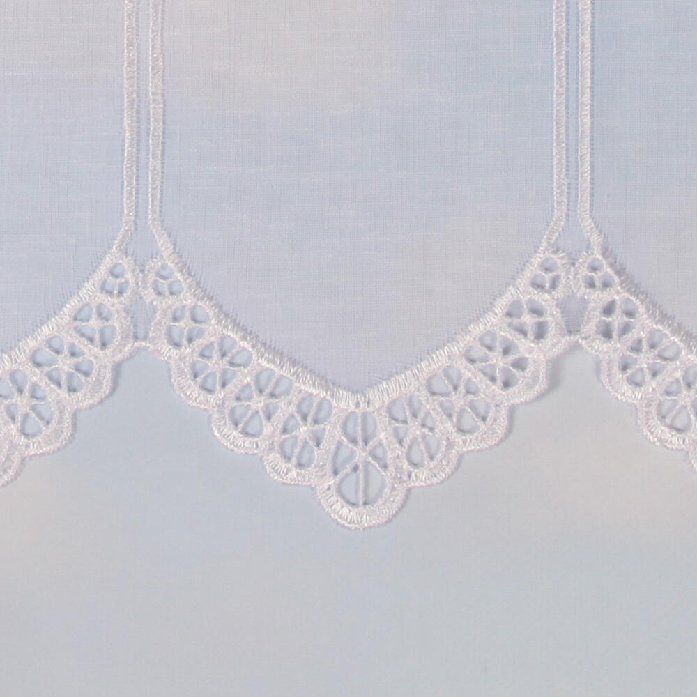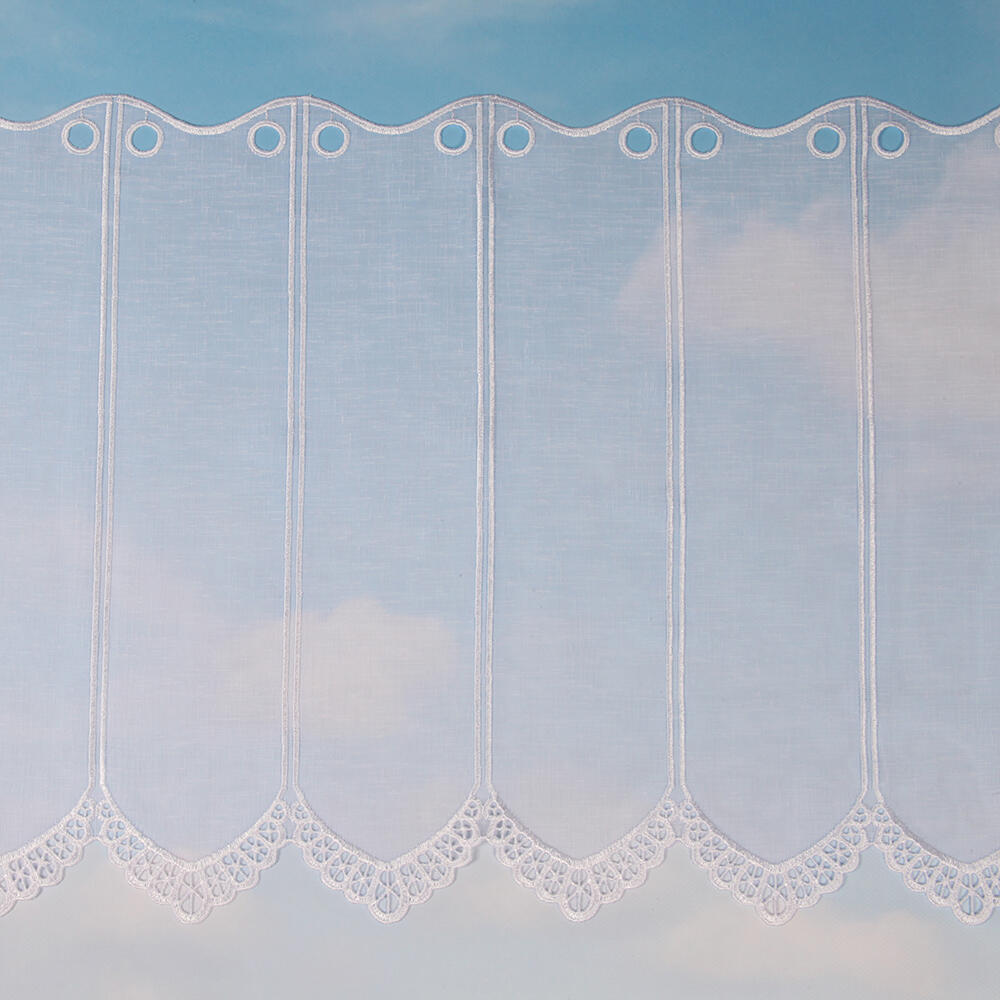Transparant geweven val in kleur wit. Ieder paneel, van 10,5 cm breed, is voorzien van een geborduurde rand. Onderzijde van de val is afgewerkt met een kanten rand. Bovenzijde voorzien van gestikte rand.