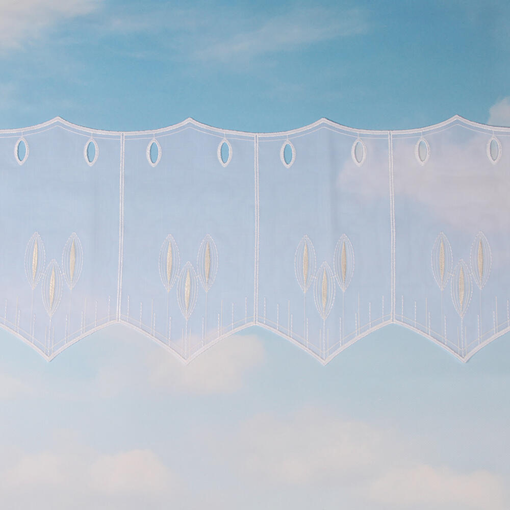 Val in transparante vitragelook. De panelen van deze val zijn geborduurd in een bladvormig patroon met een lichtglanzend wit en creme kleurig garen. Onder- en bovenkant zijn afgewerkt met stompe punten met wit glanzend garen afgezet. De panelen zijn ongeveer 16 cm breed. De gemiddelde hoogte van de val is 30cm.