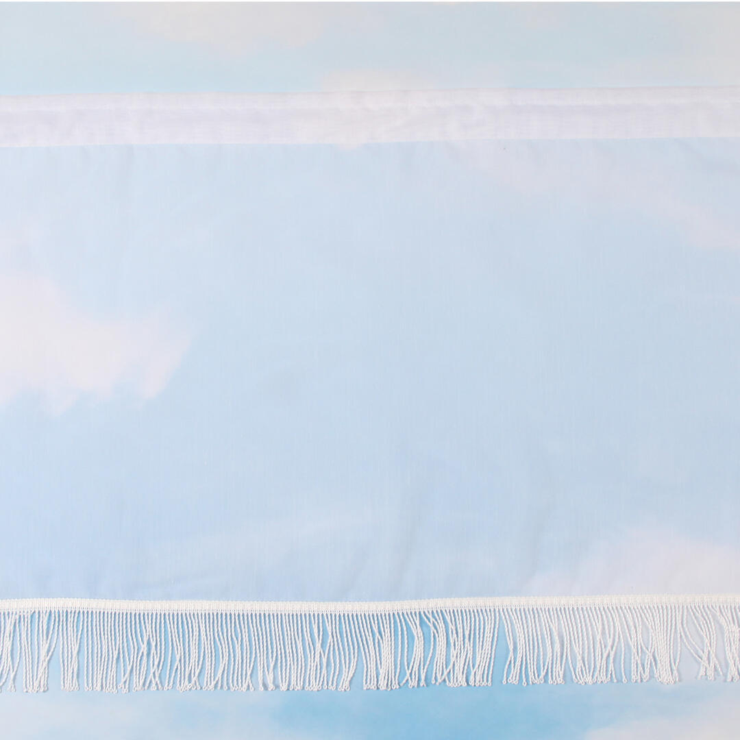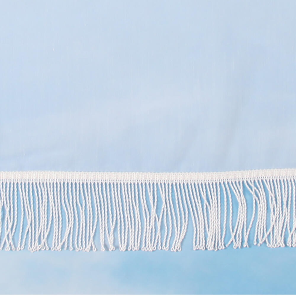 Val Cardona is een witte vitragestof met een fijn streeppatroon en met een rechte franjeband van ongeveer 8 cm. Aan de bovenkant van de franjeband lijkt het of er een dubbele satijnlint doorheen geregen zit