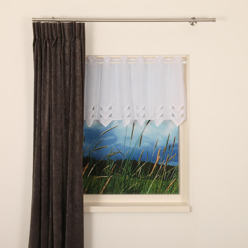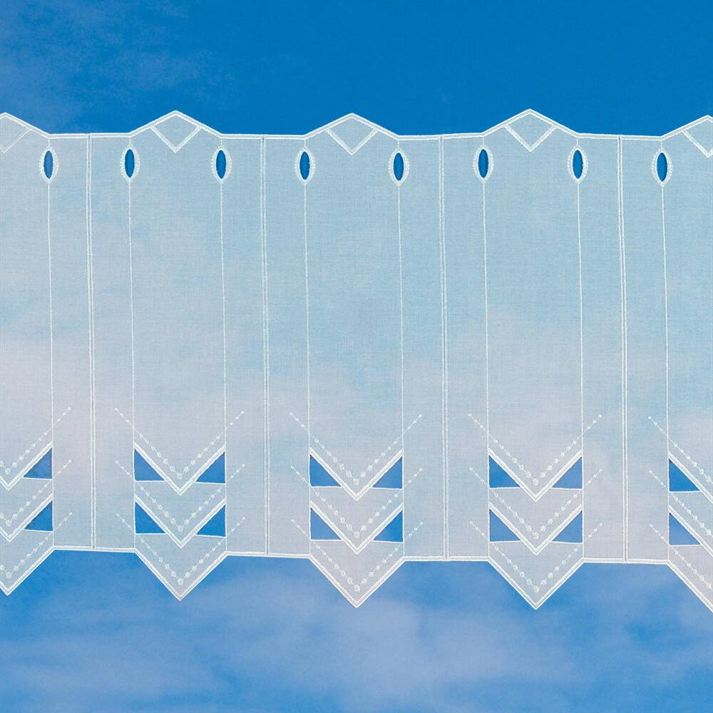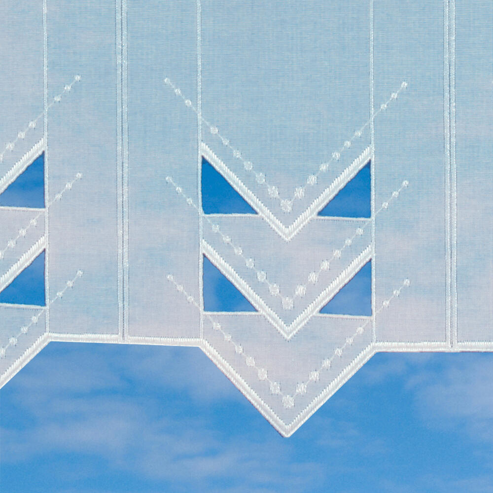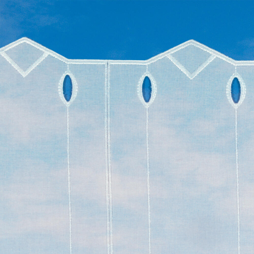 Dichtere val in fijngeweven natuurlijke look. De panelen zijn aan de onderzijde afgewerkt met een punt en gedeeltelijk opengewerkt in een strak, hoekig patroon. De geborduurde randen zijn licht glanzend. Bovenzijde is ook afgewerkt met een punt, deze komt ruim 3,5cm boven de ophangogen uit.