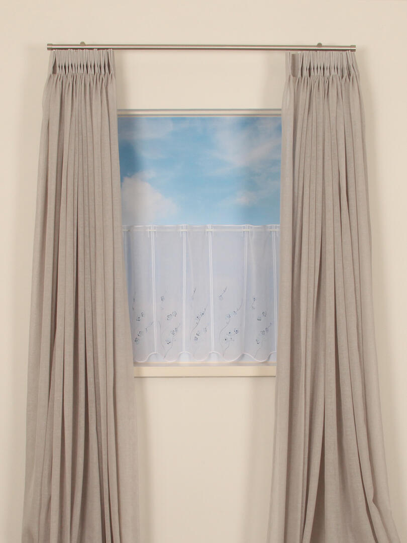Val Florette blauw is gemaakt van een vitrage met een subtiele weefstructuur. De panelen zijn rondom afgewerkt met een witte garen. Op ieder paneel zijn blauwe takken met kleine bloemen geborduurd. In het blauwe glansgaren zit een verloop van verschillende blauwtinten. Deze val is geschikt voor roedes tot 15mm doorsnee.