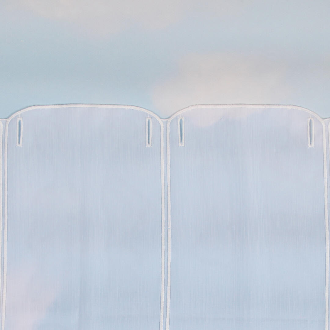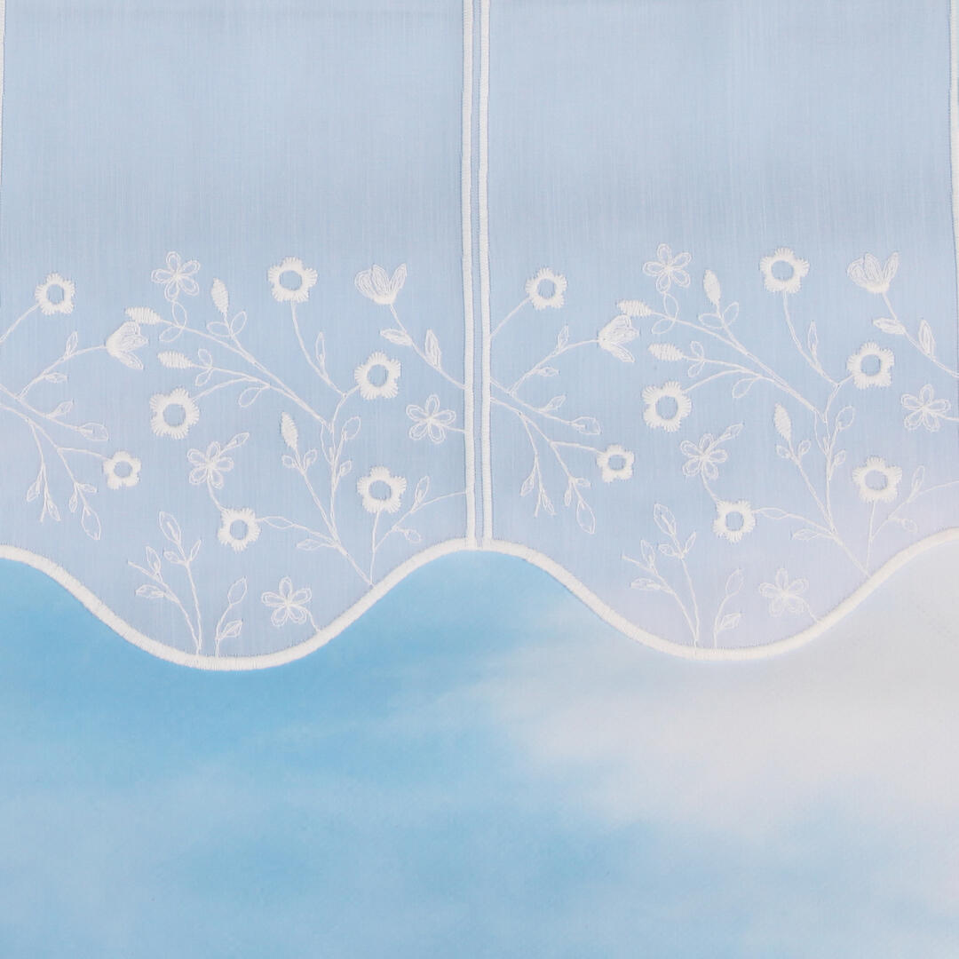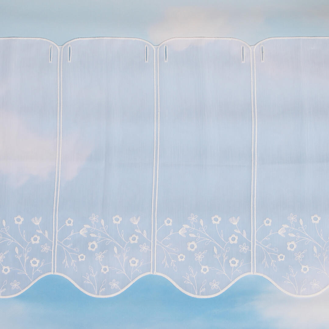 Deze transparante val is aan de onderkant afgewerkt met een sierlijk bloemenpatroon. Deze zijn geborduurd met een matte garen. De segmenten zijn 15,5 cm breed. De val heeft heel licht een verticale structuur in de stof.