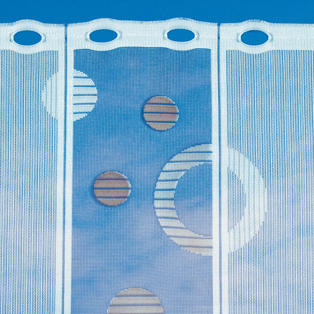 Val van panelen afwisselend recht en met punt afgewerkt. De rechte panelen zijn dichter geweven met een licht cirkelpatroon. De gepunte panelen zijn transparanter en voorzien van dichte en open cirkels in grijs(bruine) tinten. De gemiddelde hoogte van de val is 60cm.