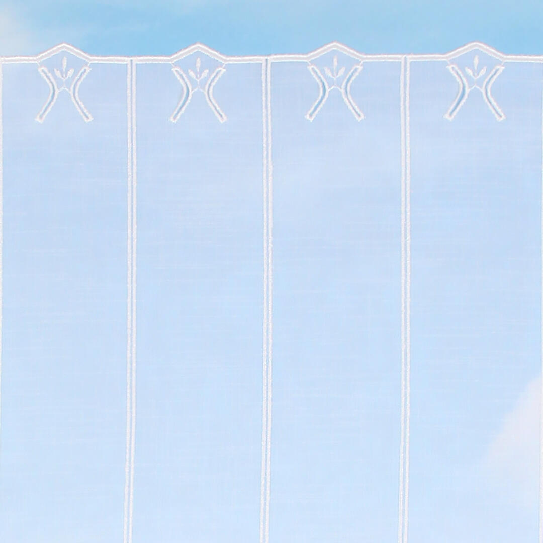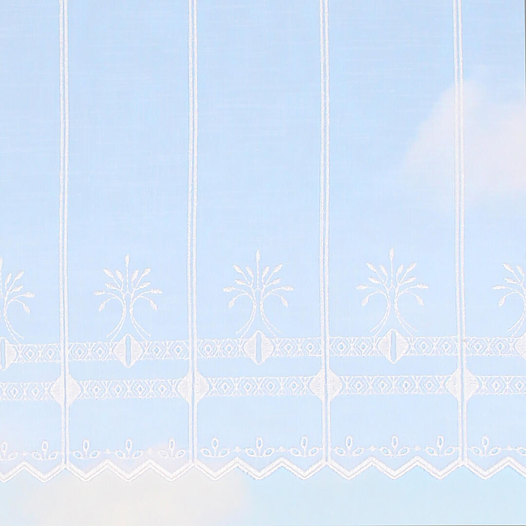 Deze val is van een zeer transparante stof waarin duidelijk een weefstructuur te zien is. De onderkant van deze val is afgewerkt met een geborduurde borderrand. Op ieder segment is boven de borderrand een boompje geborduurd. De segmenten zijn 8 cm breed. Val Lyss is ook verkrijgbaar in lengte 30 cm.