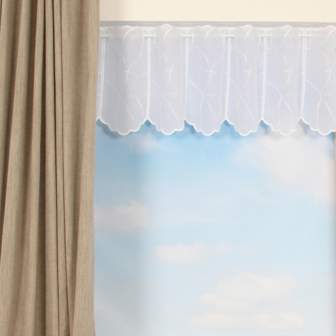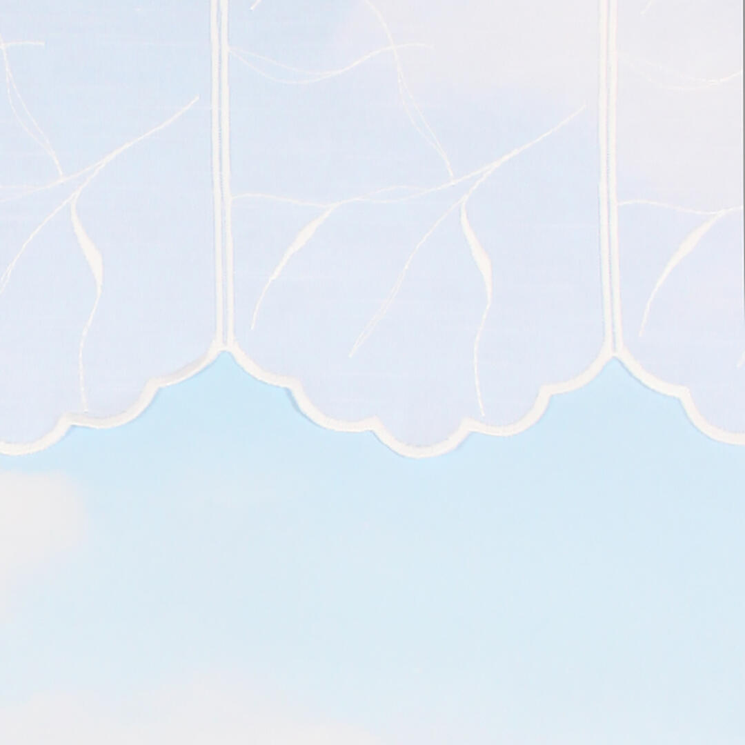Deze val is gemaakt van een open geweven vitrage. Op de panelen zijn met een matte garen dunne takjes geborduurd. De onder- en bovenkant zijn afgewerkt met een golvend schulprandje. De Segmenten zijn 16 cm breed.