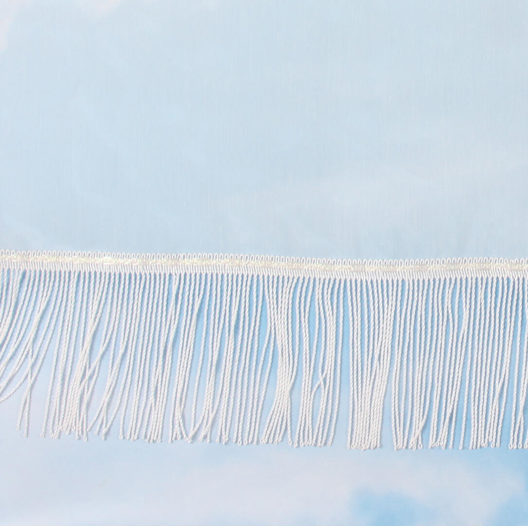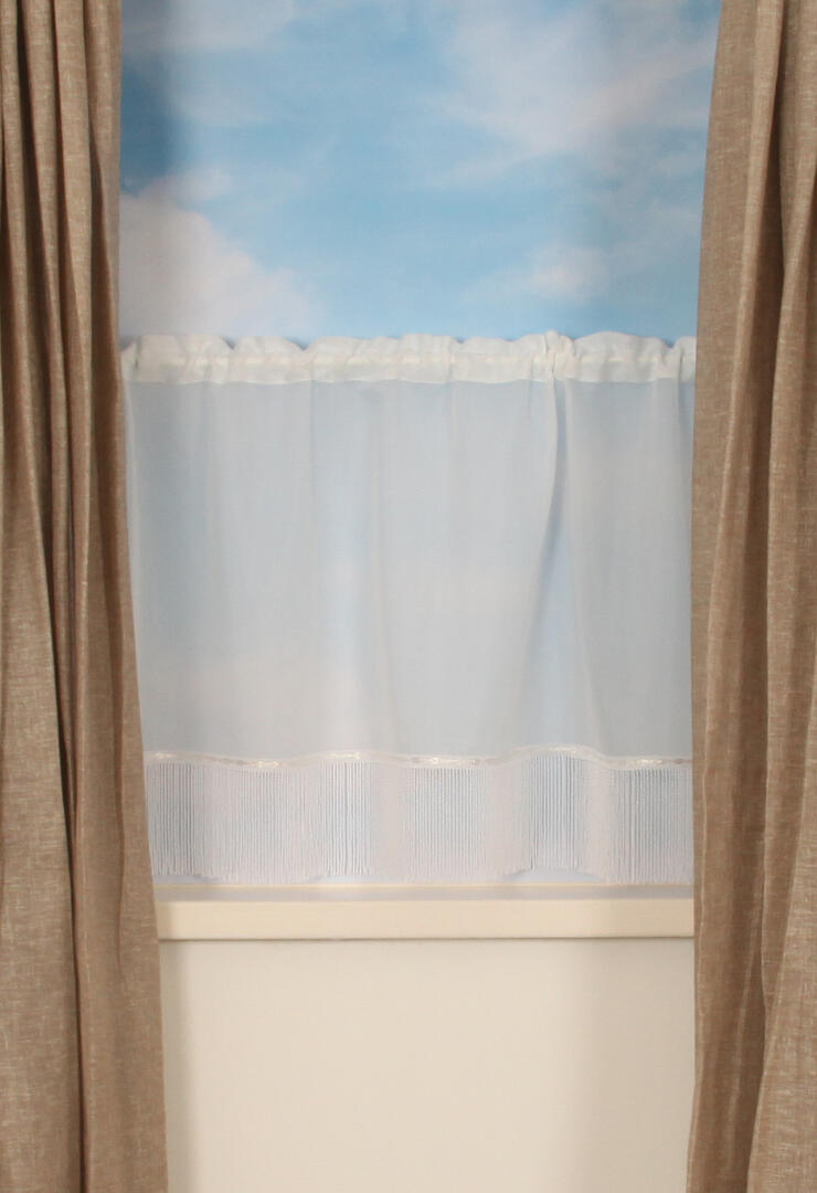 Val Villena is een offwhite vitragestof met een fijn streeppatroon en een rechte franjeband van ongeveer 15 cm. In de rand aan de bovenzijde van de franjeband lijkt alsof er een satijnlint doorheen geregen is. Hierin is ook een parelmoerkleurige draad verwerkt.